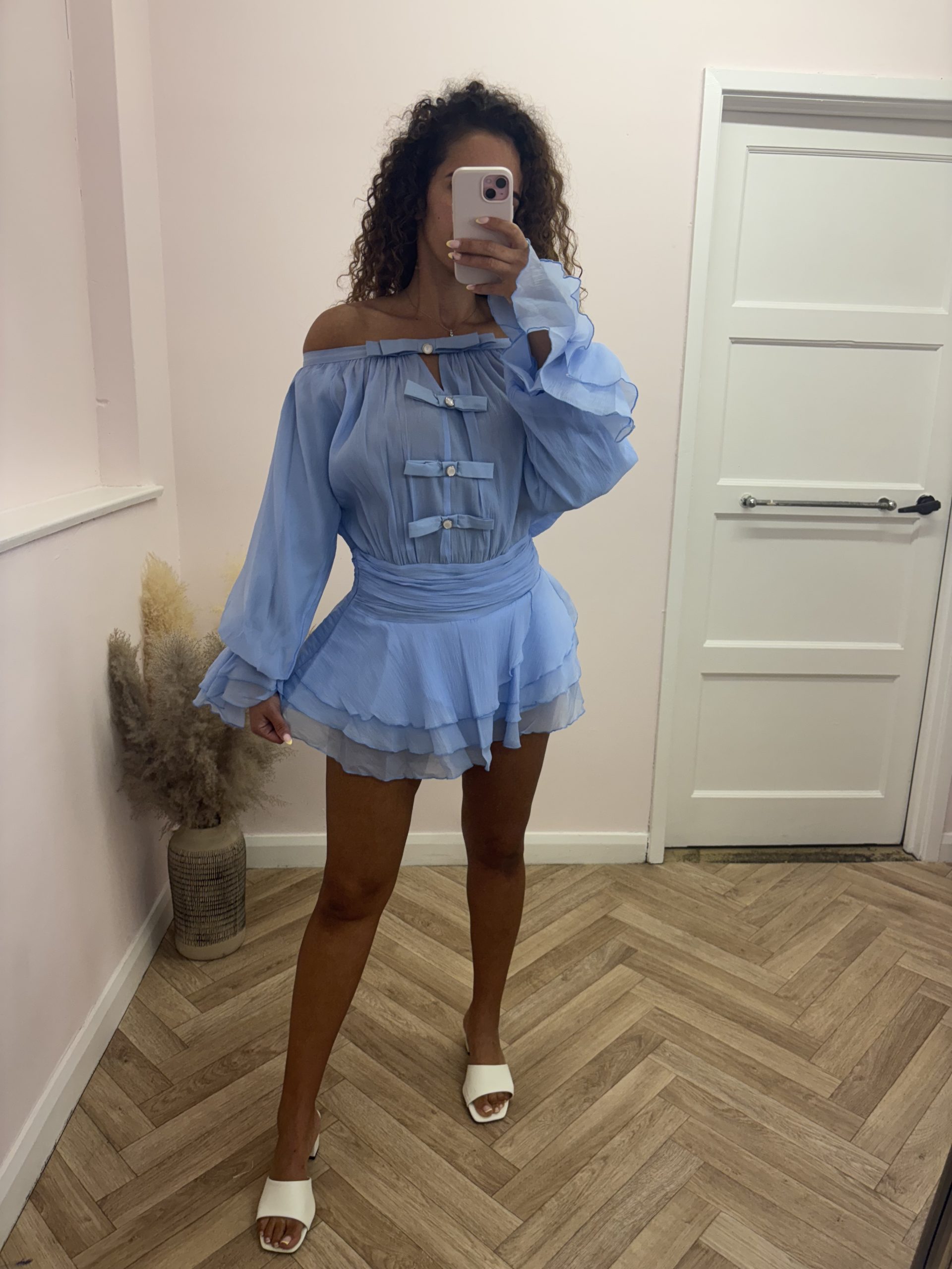 “BELLE” blue off the shoulder bow chiffon dress